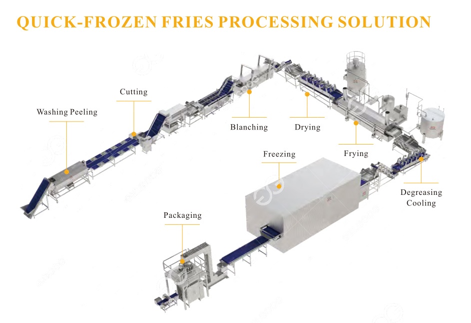 Automatic frozen french fries production line includes a series of automated French fries processing equipment, which is used to produce french fries from fresh potatoes. The production line usually consists of multiple machines, including washing and peeling, cutting, blanching, pre-drying, frying, deoiling, cooling, freezing and packing.