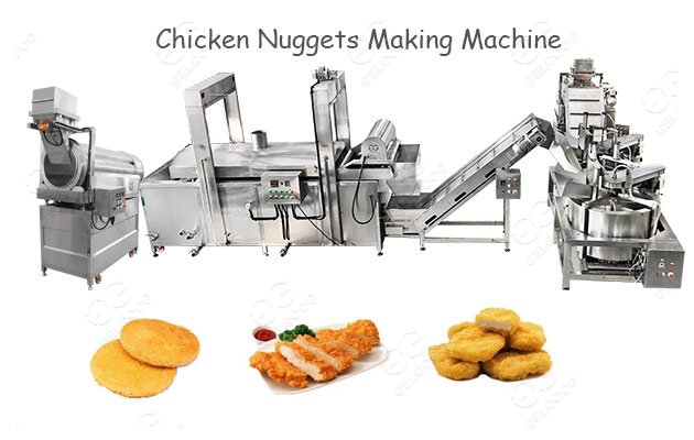 The nuggets processing procedure includes forming, battering, frying and deoiling, etc. The minced meat can be chicken meat, fish meat, seafood meat, beef, pork, lamb or even vegetables, such as potato or onion or beans etc. The shapes of final products can be changed easily, such as round, rectangle etc by changing the mould.